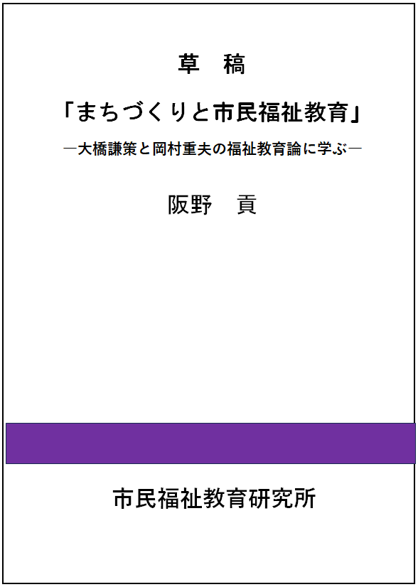〇阪野は、福祉教育の歴史研究を基盤にしながら、大橋の福祉教育論を継承し発展させつつ、「まちづくりと市民福祉教育」という概念を提示してその理論化・体系化を図る。そのひとつの集大成でもある『市民福祉教育の探究―歴史・理論・実践―』(みらい、2009年10月)は、従来の学校福祉教育や地域を基盤とした福祉教育の枠を超え、「まちづくり」とそのための「市民」の育成をめざす福祉教育のあり方を探究する。「ふくし」を「ふだんの くらしの しあわせ」というフレーズで捉えて表示するのは、1990年代中頃からである。「市民福祉教育研究所」(オンライン組織)での取り組みも特筆に値する。