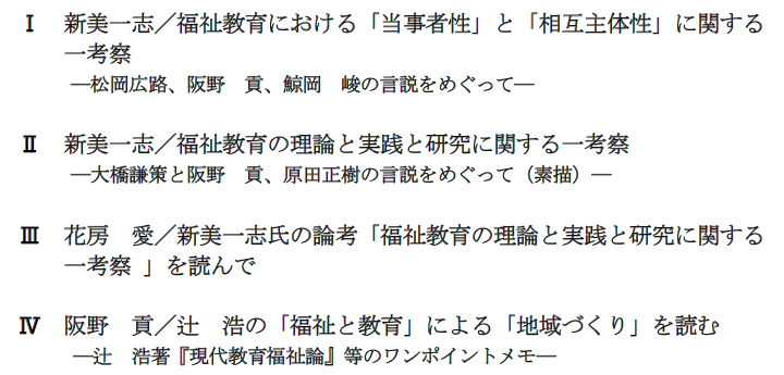 〇新美一志氏の論考「福祉教育の理論と実践と研究に関する一考察 ―大橋謙策と阪野貢、原田正樹の言説をめぐって(素描)―」を読ませていただきました。日本の福祉教育学界における主要な論客である大橋謙策、阪野貢、原田正樹の3氏の言説を、その学術的系譜と相互関連性に着目して分析した、示唆に富む論考だと感じました。とりわけ、「素描」であることの限界はありますが、➀先行研究の引用と解釈、➁学術的系譜の提示、➂いくつかの問題提起、においてです。