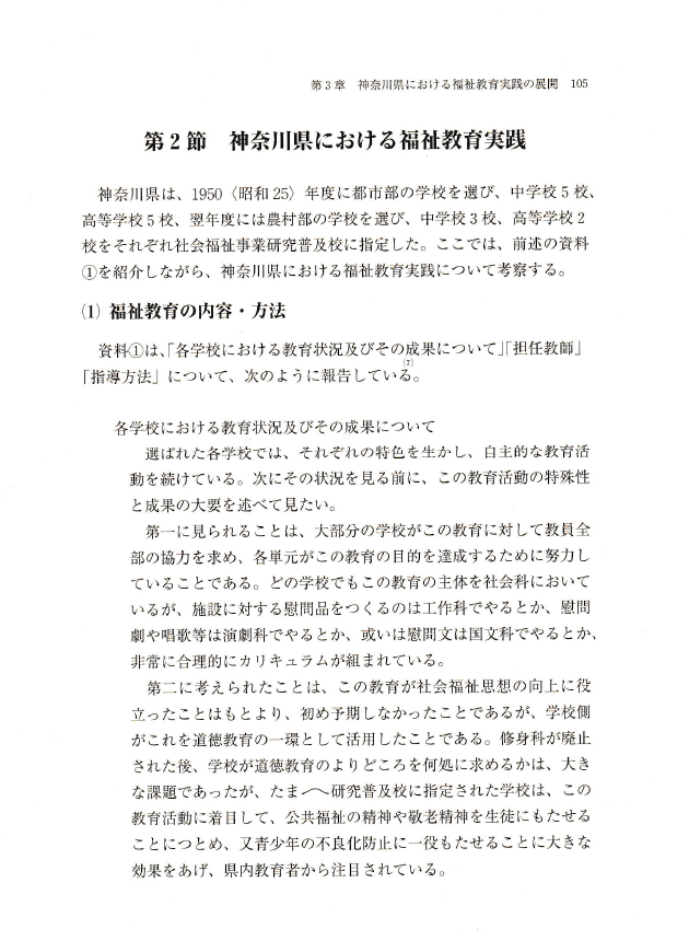 〇これまで、第二次世界大戦後における福祉教育の源流は、例えば、1946〈昭和21〉年に平岡国市によって創案された徳島県の子供民生委員制度や、1950〈昭和25〉年度から実施された神奈川県の社会事業教育実施校(社会福祉研究普及校)制度などに求められてきた(1)。また、村上尚三郎は、福祉教育の「遡及的原点」として、「大正デモクラシーが教育界に及ぼした所産とも目される1920年代の、いわゆる新教育運動の勃興に焦点をあて」、「池袋児童の村小学校」の訓導・野村芳兵衛の生活教育や修身教育の実践に着目している(2)。