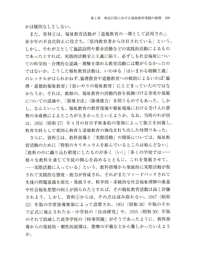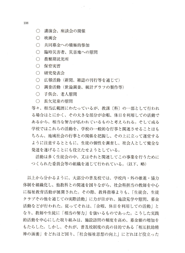 〇通史的な視座に立てば、当時の小学校を拠点とした郷土教育や、敬老・清掃といった諸活動には、現代の福祉教育にも通じる具体的な活動形態の雛形を見出すことができる。しかし、その通底をなす思想的基盤は、国家の富強と国民統合を最終目的とした「上からの教化」に依拠しており、自治や公共心は国家に対する「義務」という形態をとって要請されたものであった。こうした歴史的位相は、現代の福祉教育が「規格化された市民」や「動員型ボランティア」を創出するための統治技術へと矮小化されるリスクを内包していることを示唆している。