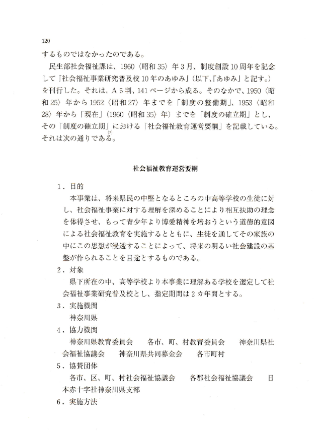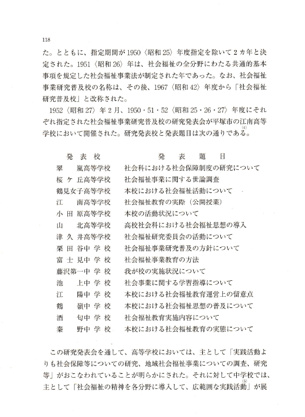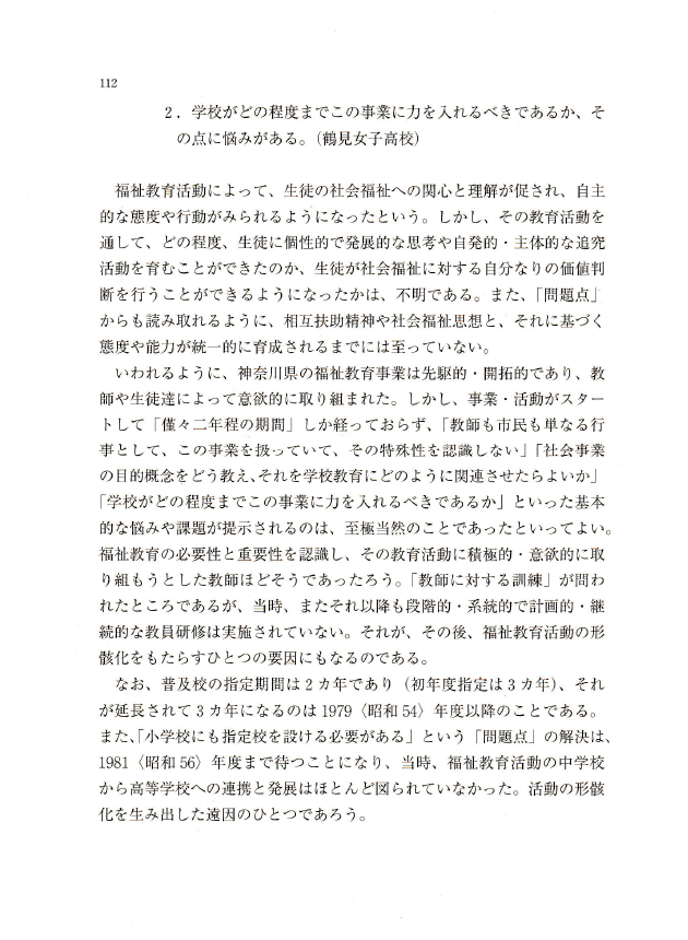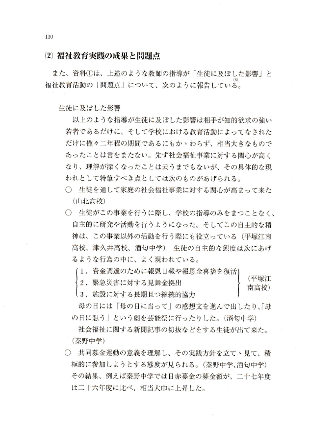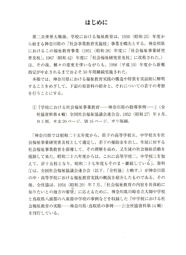 〇いうまでもなく、福祉教育研究における歴史研究は、福祉教育の歴史的事実を実証的に解明することからはじまる。すなわち、それは、たんに福祉教育の変遷を押さえるだけでなく、その変遷の意味を明らかにすることである。その際、その史実を社会的・経済的・政治的・文化的諸条件との相互関連のなかで捉えることが肝要となる。それを通じて科学的・客観的に今日の福祉教育の到達点を押さえ、それが抱える問題点や課題を発見し、その本質を把握する。そして、それを解決し克服するための適切な方向を見定め、具体的な解決策を見出す。
