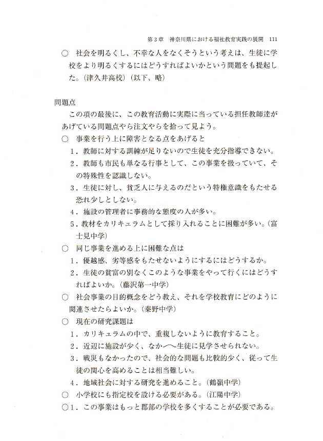 〇とはいうものの、「郷土学習」や「郷土人の生活姿態」についての調査活動の教育方法論には、その目的や内容などをめぐる時代性は異なるものの、「まちづくり」を企図する「市民福祉教育」にとって学ぶべき歴史的教訓がある。