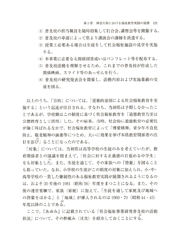 〇前者の保健衛生活動については、1897〈明治30〉年に制定された伝染病予防法に基づいて、その後、明治・大正・昭和と時代の変遷に伴って地区衛生組織活動の推進が図られることになる。そのなかの住民各層に対する広報・教育活動の実践に、福祉教育のひとつの原型を見出すことができる。また、後者の敬老(会)活動については、時代性は異なるものの、現象的には今日の福祉教育の主要な体験活動(体験学習)のひとつである高齢者理解や高齢者との交流・共生活動に通じるものである、といえよう。
