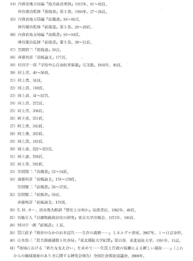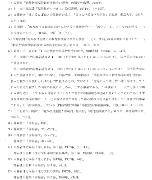 〇今日、地域コミュニティの再編や互助機能の強化が喧伝される背景には、公的扶助の漸次的な後退や自己責任論の趨勢といった構造的課題が潜在している。地方改良運動の歴史的経験から得られる真の教訓は、教育実践の形式的模倣に終始することではなく、教育実践における「主体」のあり方を批判的に再定位することに他ならない。
