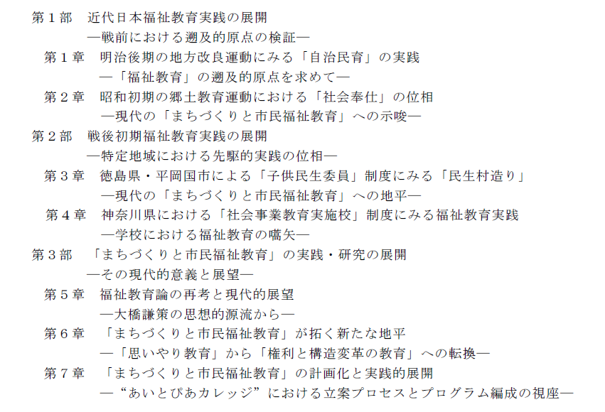 〇当時の運動は、疲弊する農村社会の再生(地域福祉的課題)に対して、教育の側からいかなる実践を提示したのか、またそれが戦時体制の進展のなかでいかに変質し、何を喪失したのか。その点を考察することは、現代の「まちづくりと市民福祉教育」における住民主体形成のあり方を問ううえで、ひとつの示唆を与えるものである。