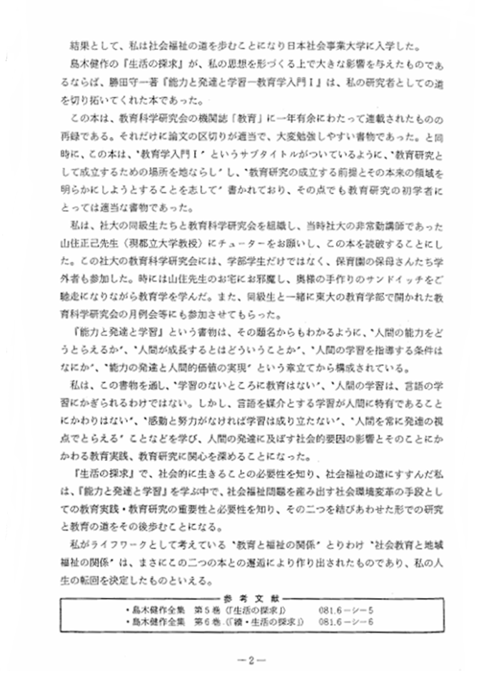 ②演者は、そのような状況の中、1960年代以降「地域福祉と社会教育の学際研究・実践」を「異端」扱いされながら、市町村社会福祉協議会、市町村の公民館、社会教育を基盤に展開してきた。